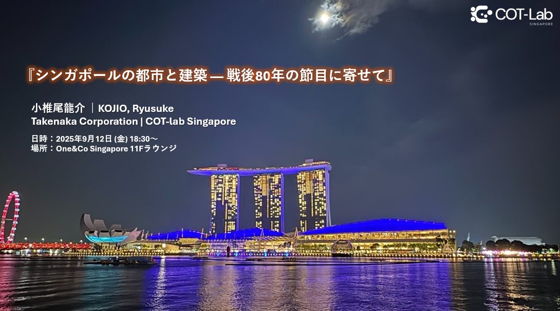 日系設計施工会社の一アーキテクトの視点から、植民地時代から現代までのシンガポールの都市発展プロセスを辿ります。日本との関わりが見られる具体的な建築事例や都市計画を紹介し、戦後復興期における両国の協力関係と建設業界の役割について解説します。歴史的な出来事が都市空間にどのような痕跡を残し、それらがいかに人々の記憶の継承と未来の形成に寄与しているかを探求します。戦争という困難な時代を経て築かれた現在の協力関係を、物理的な都市環境の変遷を通じて新たな角度から理解することを目指します。戦後80年という節目の年に、都市と建築が担う社会的役割について共に考察する機会としたいと存じます。現地での実体験に基づく知見や両国の文献等からの情報を共有させて頂き、ご参加頂く皆様と様々な議論が出来れば有難いと思います。